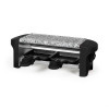 Appareil à raclette 2 personnes. Puissance 350 W, plateau amovible en granite, surface de cuisson 20 x 10 cm, thermostat automatique, 2 spatules en bois et 2 caquelons avec revêtement antiadhésif sans PFAS, poignées thermo résistantes, 4 pieds antidérapants, bouton on/off.