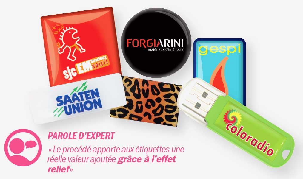 Le doming est le dépôt d'un dôme de résine sur une étiquette autocollante sur laquelle est imprimée un visuel en quadrichromie.