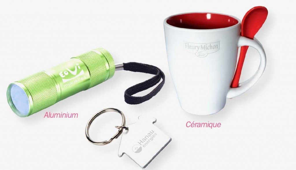 Cette technique est parfaitement adaptée aux surfaces métalliques ou céramiques (stylos, porte clés, couteaux, mugs...)
