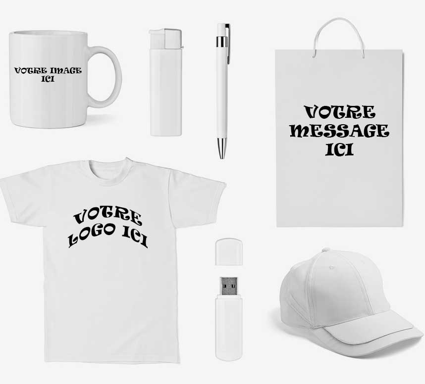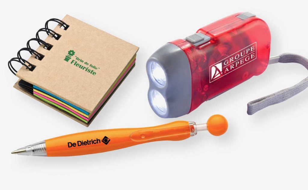Les stylos, les briquets, les porte-clés, les carnets et la plupart des objets en plastique peuvent être marqués en tampographie.
