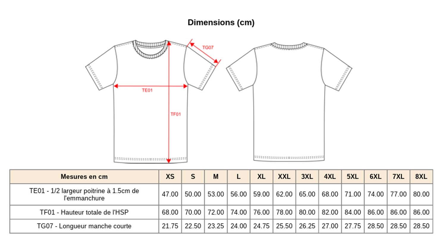 Impression 1 couleur - Poitrine - 7XL au 8XL 7.15 3.34 1.91 1.33 0.82 0.70 0.60 0.44